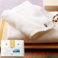 清らかな白なみのように美しい、純白の今治タオル。凹凸感のある独特な風合いが心地よいあぜ織りに仕立てました。高級感のある木箱に丁寧に詰め合わせ大切な方へお贈りいたします。
