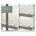 大人のグレージュカラーでシックな空間を演出。高級感のあるグレーとあたたかみのあるベージュを混ぜ合わせた、グレージュカラーのタオルセット。甘撚りの糸で織り上げ、ふんわりとした肌触りです。長い歴史の中で培われた今治のジャガード織で、ゆったりとしたオーナメント柄を繊細な曲線美で表現。優しいグラデーションにも、糸染めの業が光ります。