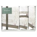 大人のグレージュカラーでシックな空間を演出。 高級感のあるグレーとあたたかみのあるベージュを混ぜ合わせた、グレージュカラーのタオルセット。甘撚りの糸で織り上げ、ふんわりとした肌触りです。長い歴史の中で培われた今治のジャガード織で、ゆったりとしたオーナメント柄を繊細な曲線美で表現。優しいグラデーションにも、糸染めの業が光ります。