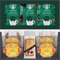 スターバックスコーヒーギフトと、お菓子のセットでワンランクアップのひとときを。スターバックスの香り高いコーヒーを手軽に楽しめるドリップタイプのセット。焼き菓子とともにあの方へ。