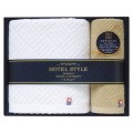 高級ホテルで使われるイメージでホテルタイプのタオルを作りました。しっかりとした織の使い勝ってのいいタオルは、お風呂上りやヘアードライに最適なものとなっています。また、上げ落ちによるジャガード織でシンプルで洗練されたイメージの仕上がりとなっています。白とゴールドとの組み合わせもベーシックでどんなシーンでも落ち着いた雰囲気を醸し出しています。スタイリッシュな贈り物としてお使いいただけます。