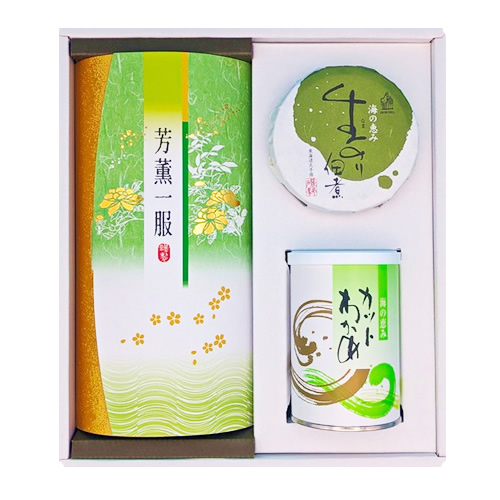 【内容】静岡深むし茶80g、カットわかめ35g、のり佃煮90g
