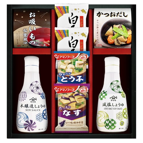 【内容】ヤマサ鮮度しょうゆ200ml、ヤマサ鮮度減塩しょうゆ200ml、永谷園お吸いもの(2.3g×2)、白子のり味のり(8切5枚)×2、アマノフーズいつものおみそ汁なす9.5g、アマノフーズいつものおみそ汁とうふ10g、シーラックかつおだし(4g×3)
