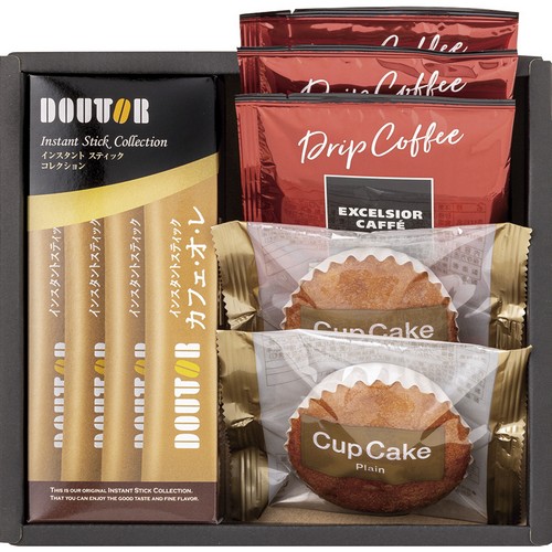 【内容】エクセルシオールカフェドリップコーヒー(モカブレンド8g)×3、カップケーキ(プレーン)×2、ドトールインスタントスティックカフェオレ(9.5g×4本入)×1
