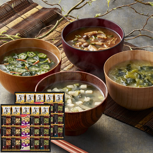 【内容】たまごスープ6.4g×10、とうふと油揚げのおみそ汁、2種のきのこの赤だしおみそ汁、あおさとわかめのおみそ汁、オクラ入ねばねば野菜スープ、アマノフーズいつものおみそ汁なす×各6