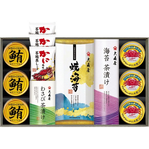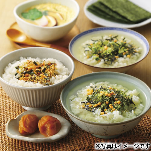 【内容】焼海苔(8切8枚×2)・海苔茶漬け(5.4g×4)・わさび茶漬け(5.6g×2)×各1、かに風味茶碗蒸しの素(2食分)・まるずわいがにほぐしみ55g・鮪油漬フレーク70g×各3