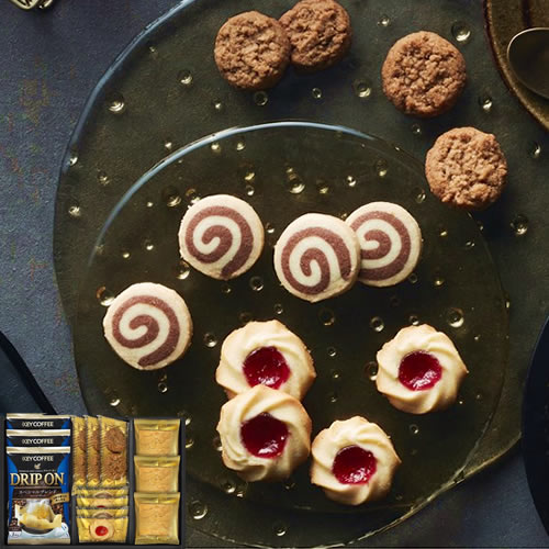 【内容】キーコーヒードリップ8g×3、クッキー(プチラズリン×2、うずまき×2、プチコーヒー2枚入×3、トフィーアーモンド×3)