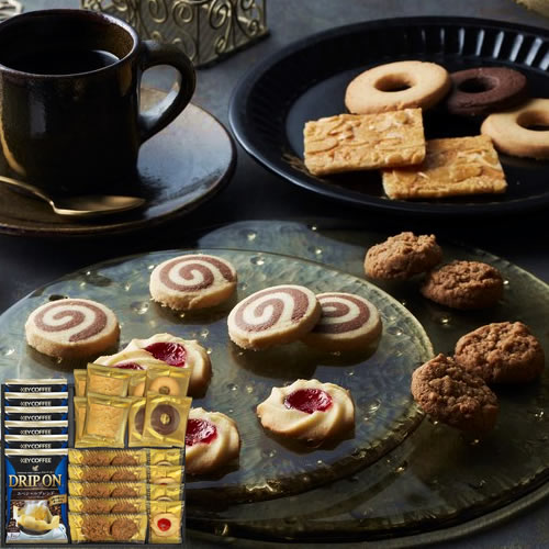 【内容】キーコーヒードリップ8g×6、クッキー(プチラズリン×2、うずまき×2、トフィーアーモンド×4、プチコーヒー2枚入×5、リングバター×2、リングココア×2)