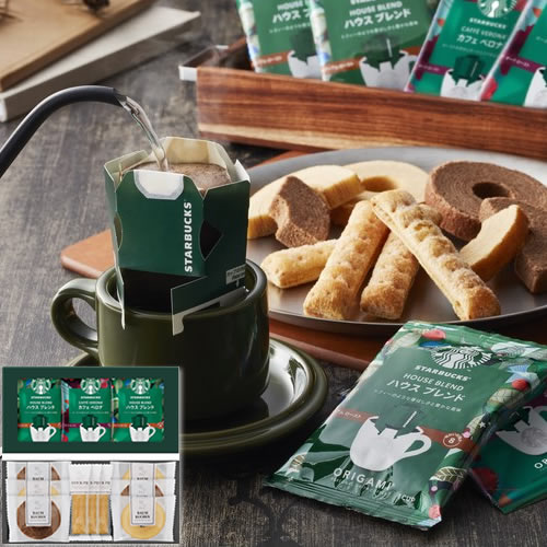 【内容】スターバックスオリガミドリップコーヒー(ハウスブレンド9g×3・カフェベロナ9g×2)、バウムクーヘン(ココア・バニラ)×各3、スティックパイ(プレーン)×3