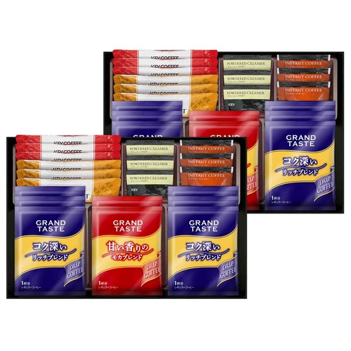 【内容】キーコーヒードリップ(リッチブレンド1杯分×12、モカブレンド1杯分×4)、キーコーヒースティック(カフェオレ7g×6、カフェモカ7.8g×6)、キーコーヒーインスタントコーヒー2g×6、キーコーヒークリーミーパウダー2.5g×6